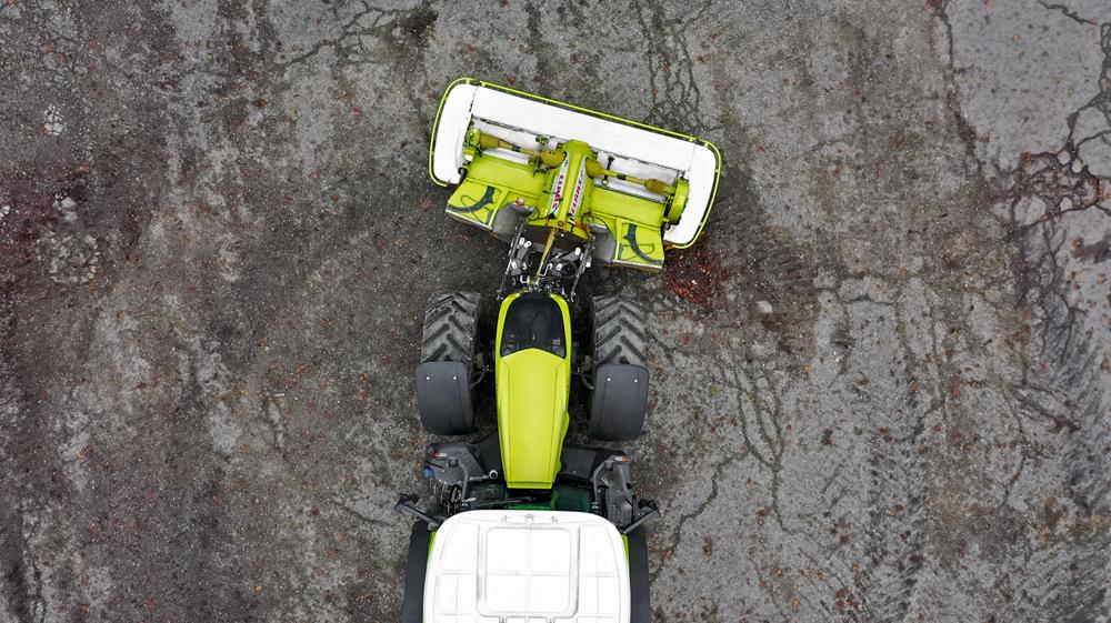 O dispositivo hidráulico pode ser adaptado a coortadores frontal e traseiro, o que poderá eliminar completamente a faixa de erva deixada ao negociar curvas e para trabalho em encostas. Com os novos tirantes inferiores giratórios, a unidade do cortador frontal é ativada para o interior das curvas, eliminando tiras e sobreposições indesejadas, dependendo do ângulo da direção (máximo de 30 cm para qualquer dos lados), e também reduz o risco de repisar a faixa dianteira.
