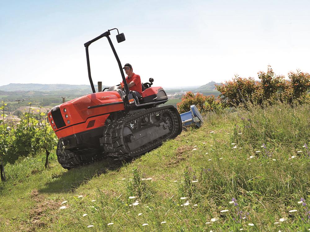 Apresenta um posto de condução rebaixado e a possibilidade de ser equipado com rastos estreitos ou largos, em ambos os casos com 5 rolos por rasto, para uma ampla superfície de apoio.