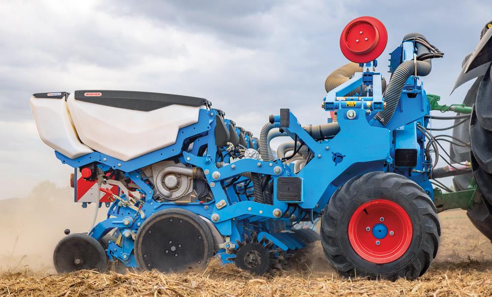 A distribuição é feita através de aspiração, mas com uma arquitetura diferenciada face à restante gama, o que inclui discos de sementeira de rápida substituição para alternar entre culturas. Nos elementos de contacto com o solo, a marca francesa propõe discos de 45 cm associados a rodas compactadoras com o mesmo diâmetro. Os primeiros garantem uma melhor penetração no solo, minimizando a projeção de terra e as segundas visam assegurar uma profundidade regular.