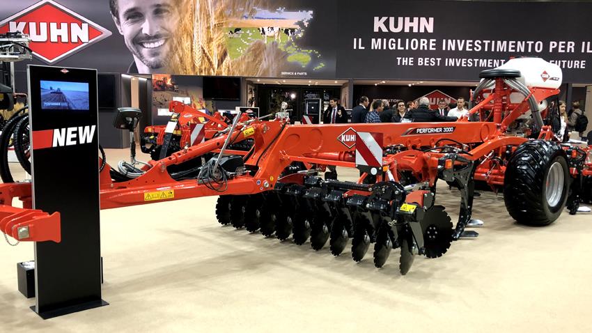 Representada em Portugal pela Auto Industrial, a Kuhn levou 23 equipamentos à Eima, entre as quais a Performer 3000, tida como a de entrada das cinco séries desta preparadora de solos. Sublinha o fabricante que se destaca pela versatilidade e combinação das ferramentas ao executar várias tarefas com uma só passagem após a colheita.